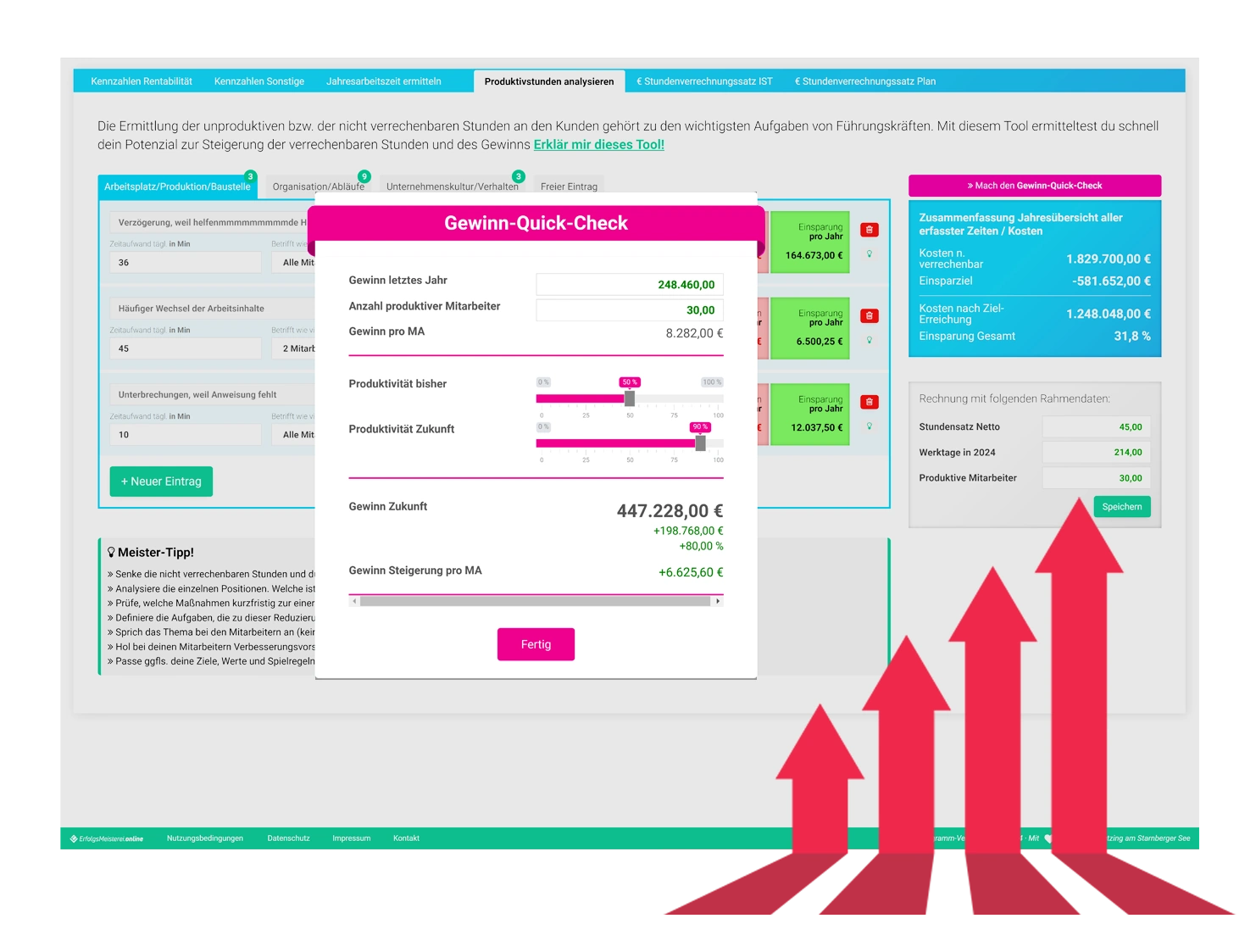 Links siehst du das Produktiv-Werkzeug mit Gewinn-Quick-Check – eines von über 30 Werkzeugen im LösungsRaum.