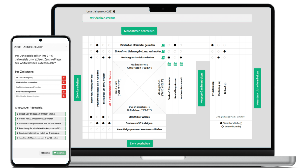 Rechts siehst du das Ziel- und Entwicklungstool: Du planst, vereinbarst und verfolgst deine Ziele – verbindlich und messbar.
